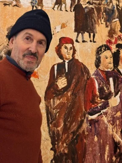 In this exhibition, the paintings do not seek to reconstruct a bygone era. Instead, they explore its lingering traces: those of figures, gestures and symbols, but also those of the media themselves. Weathered wood, reclaimed materials and worn surfaces become sites of silent resistance to the passage of time. They carry within them a history that predates the images they now bear.